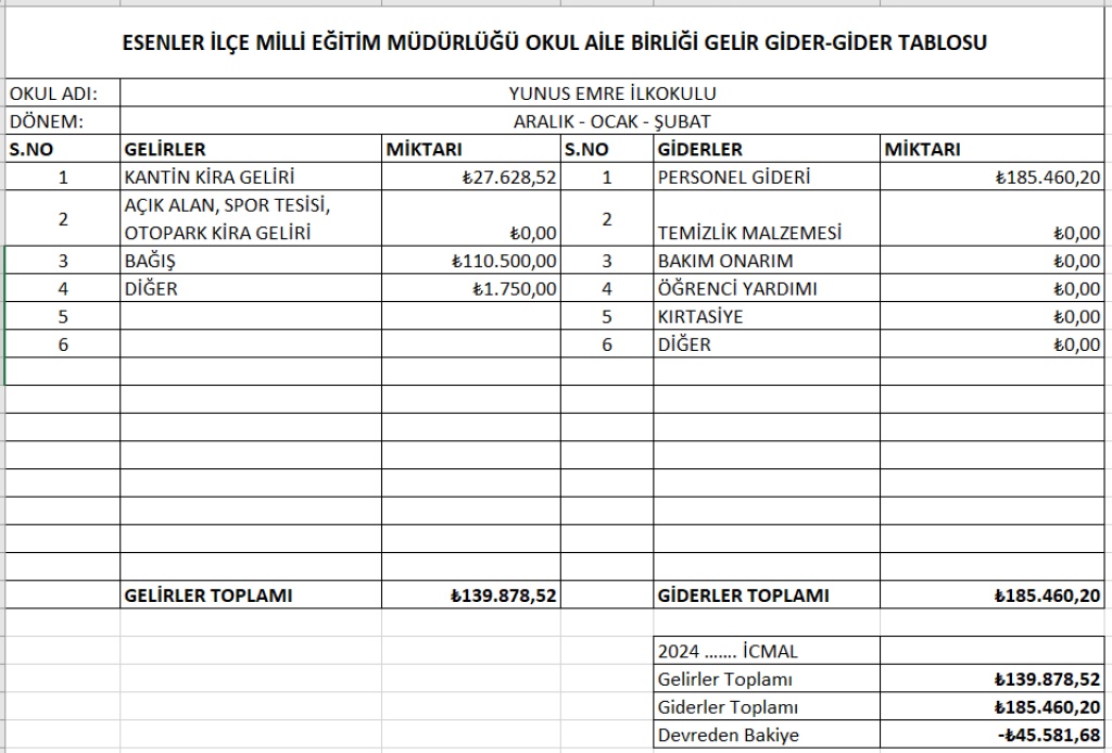OKUL AİLE BİRLİĞİ ARALIK-OCAK-ŞUBAT AYLARI GELİR-GİDER TABLOSU