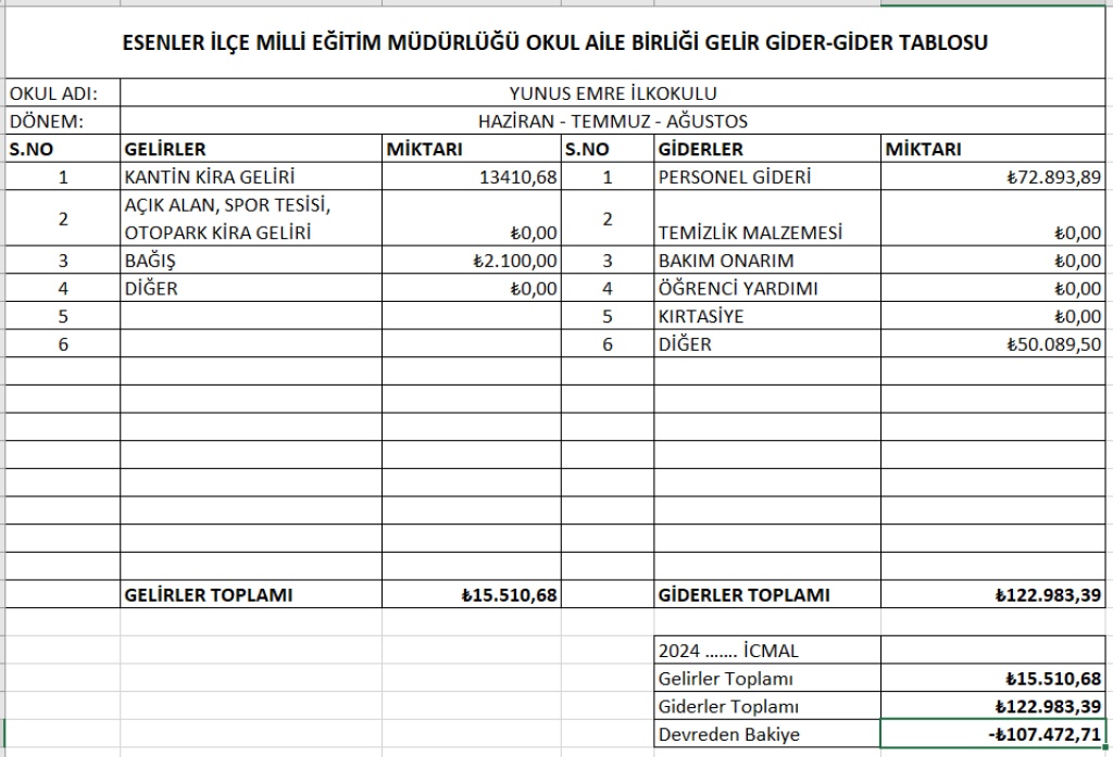 OKUL AİLE BİRLİĞİ HAZİRAN-TEMMUZ-AĞUSTOS AYLARI GELİR-GİDER TABLOSU