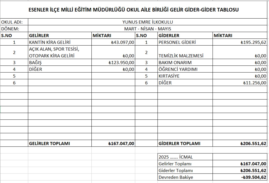 OKUL AİLE BİRLİĞİ MART-NİSAN-MAYIS AYLARI GELİR-GİDER TABLOSU